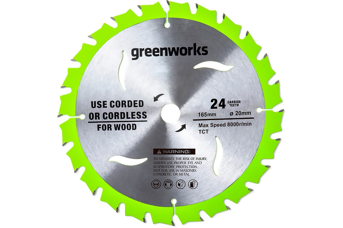 Greenworks 2955707 диск пильный по дереву 165х20х1,6/1,1мм 24Т, АТВ 20гр.