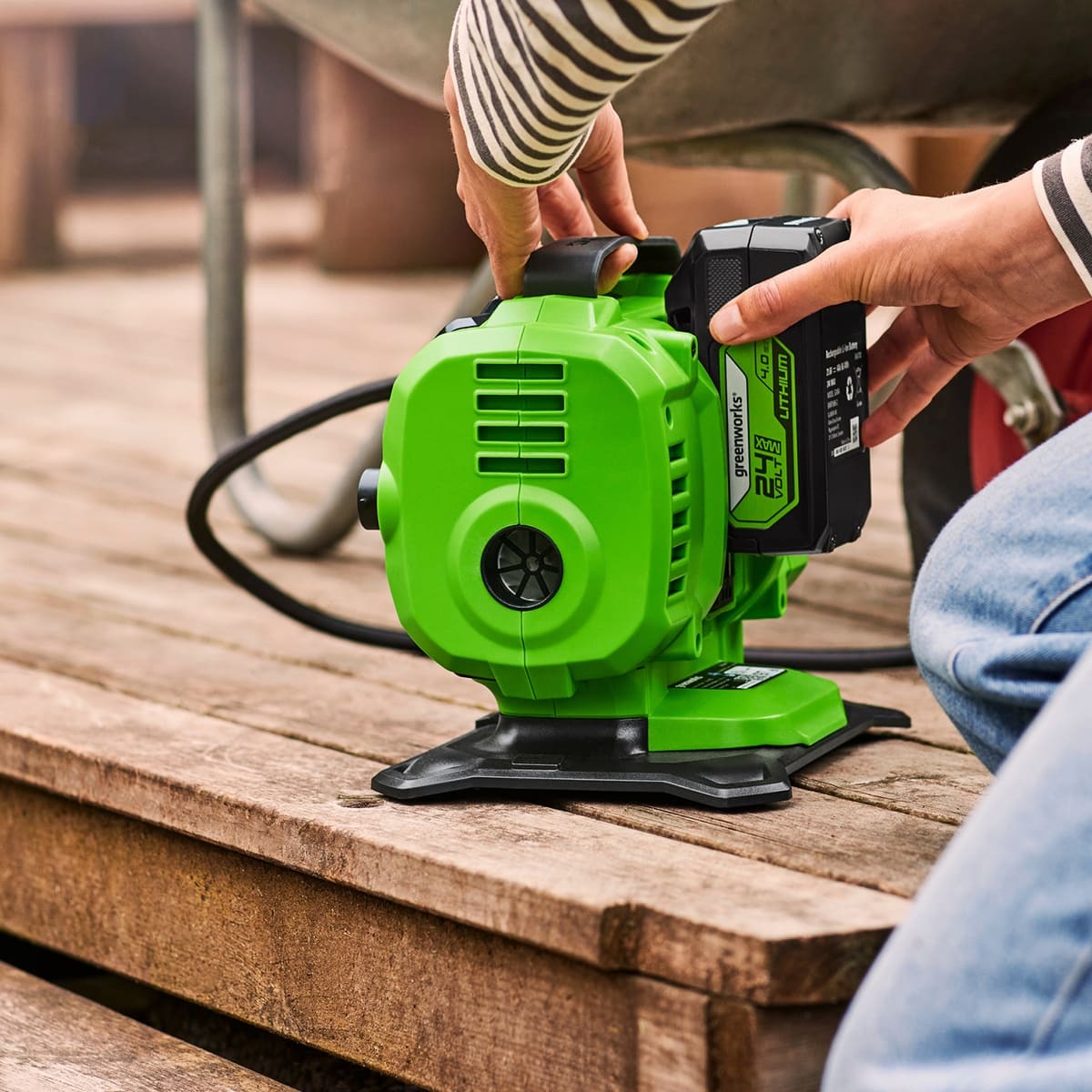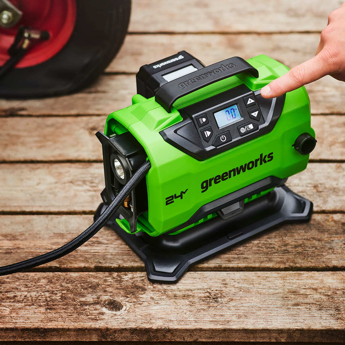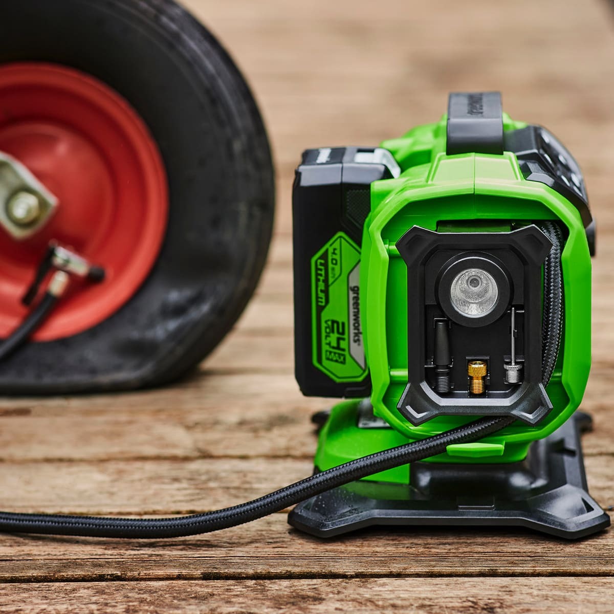 Greenworks 3400807 компрессор автомобильный аккумуляторный ACG301 24V + сеть 12V