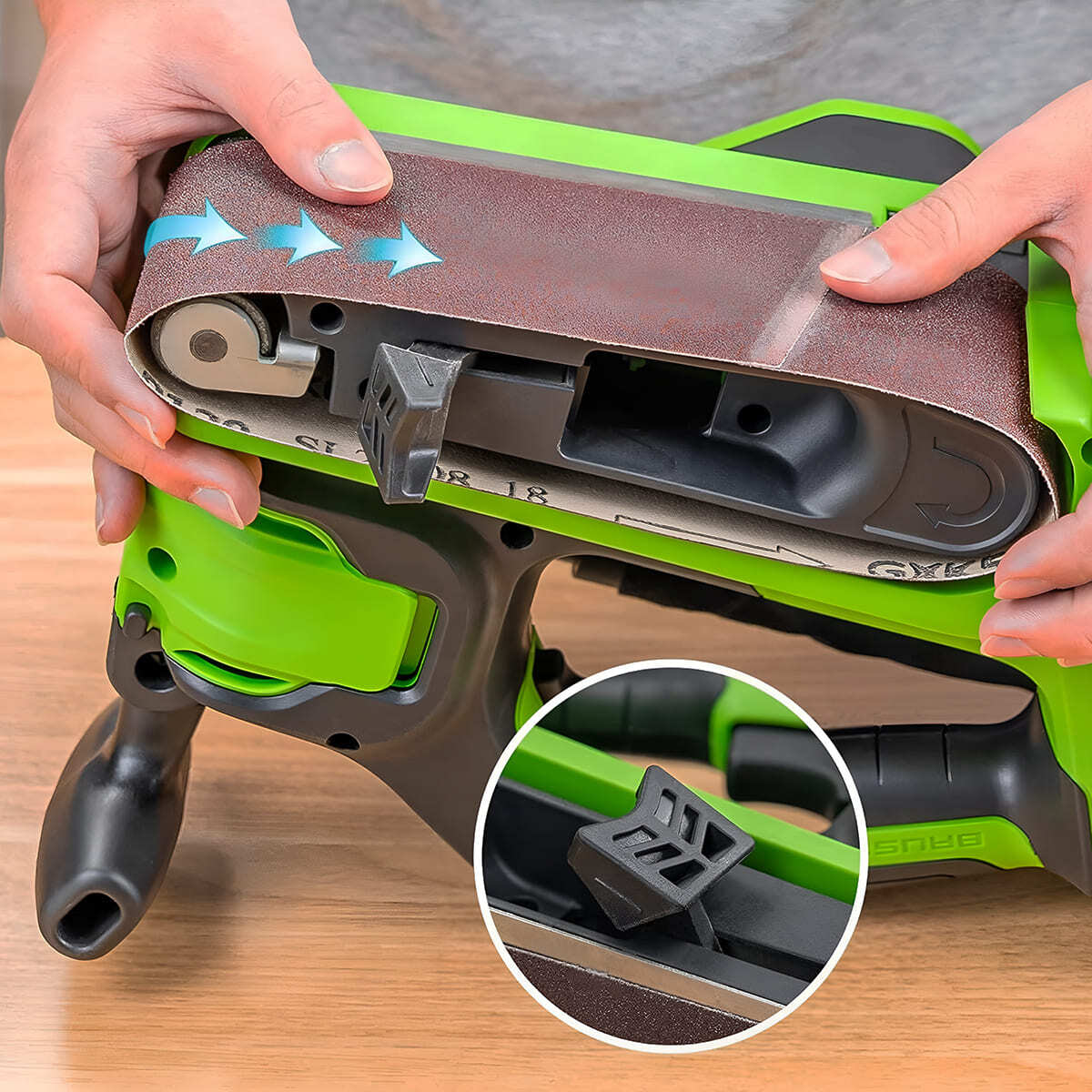 • Шлифмашина имеет бесключевую систему для быстрой замены и регулировки натяжения шлифовальной ленты.