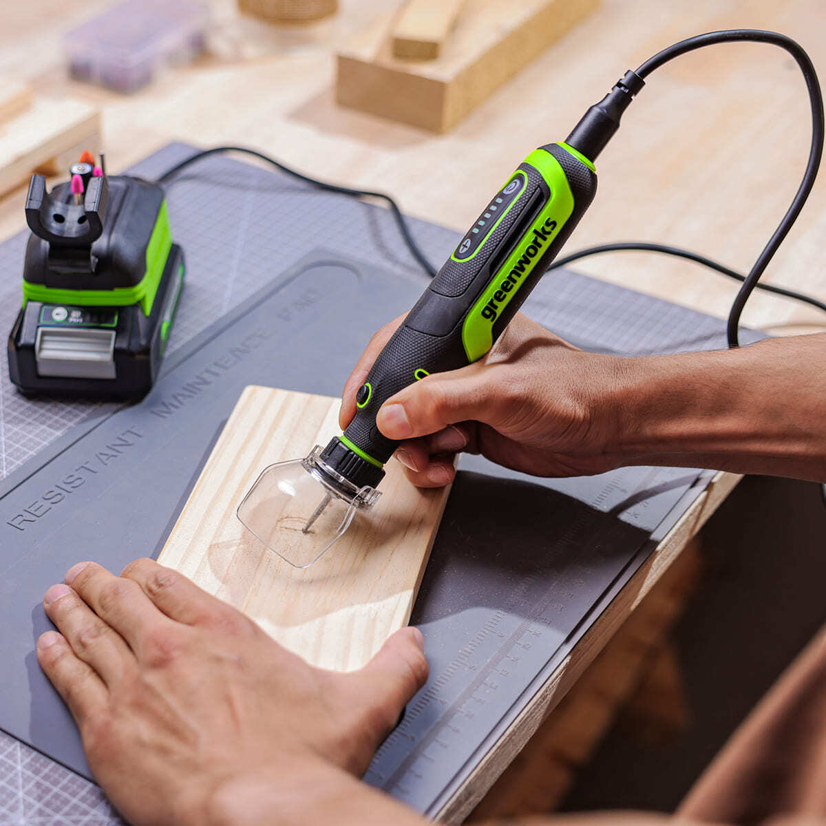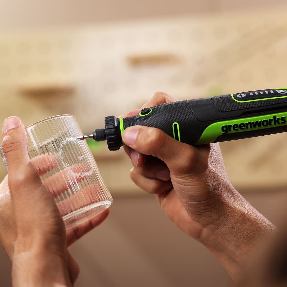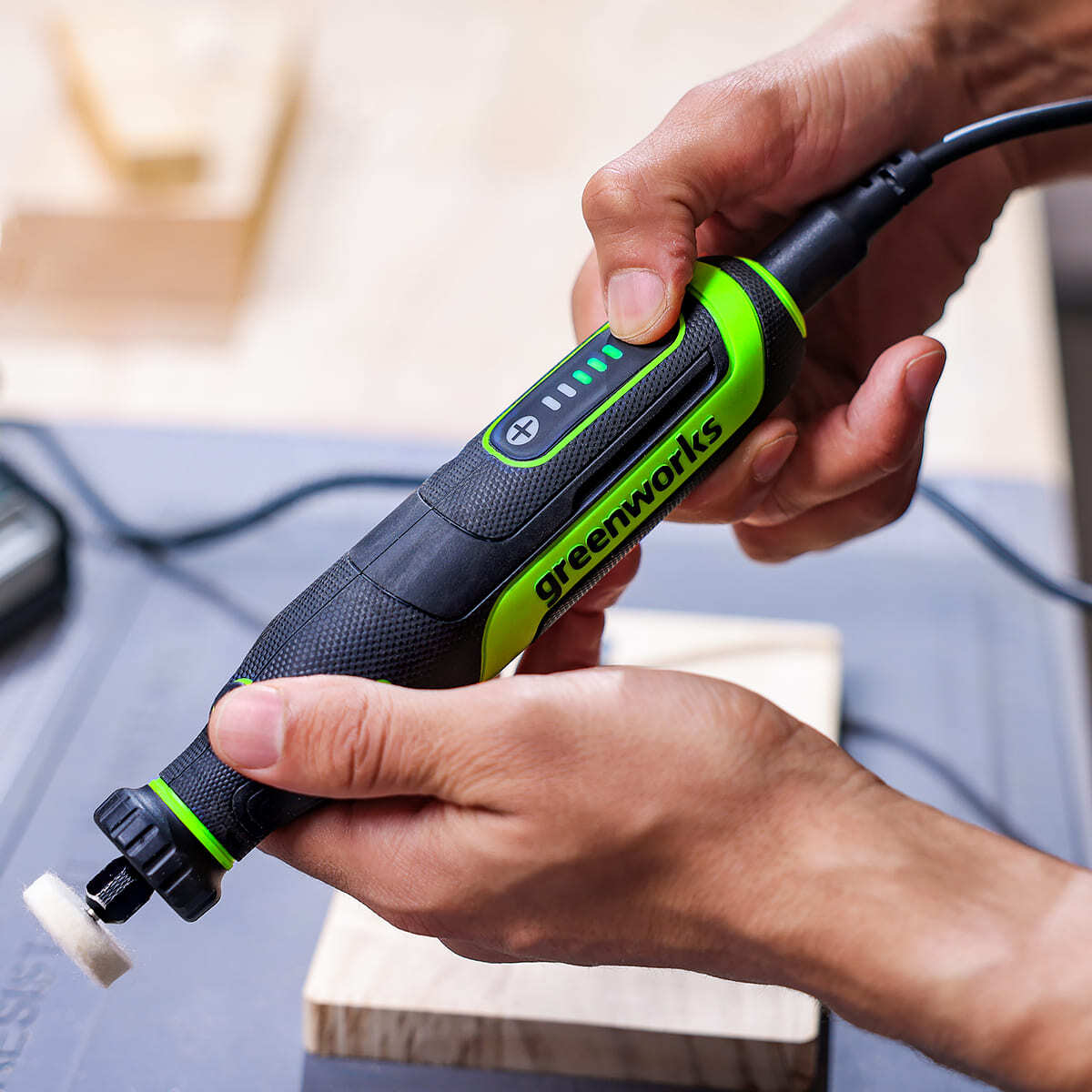 Для настройки под определенную задачу гравёр имеет пять (5) ступеней регулировки числа оборотов, с помощью кнопок "+" и "-" и LED-индикаторов на корпусе.