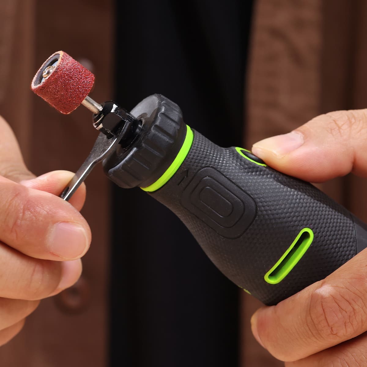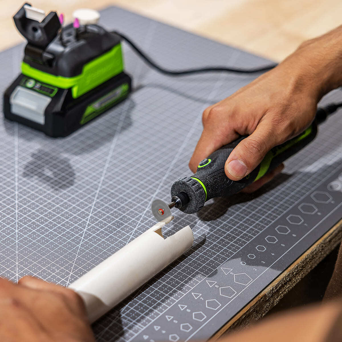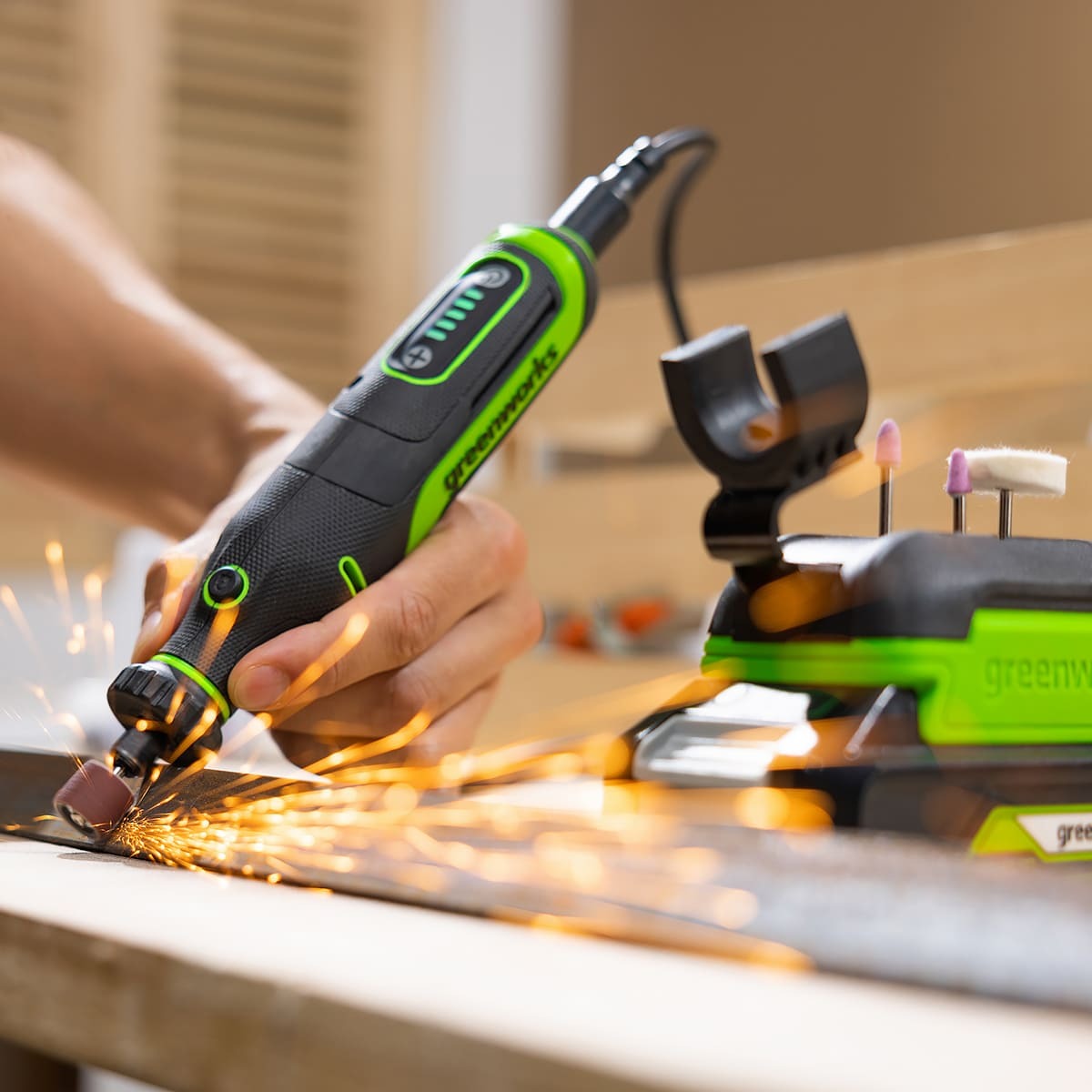 Для настройки под определенную задачу гравёр имеет пять (5) ступеней регулировки числа оборотов, с помощью кнопок "+" и "-" и LED-индикаторов на корпусе.