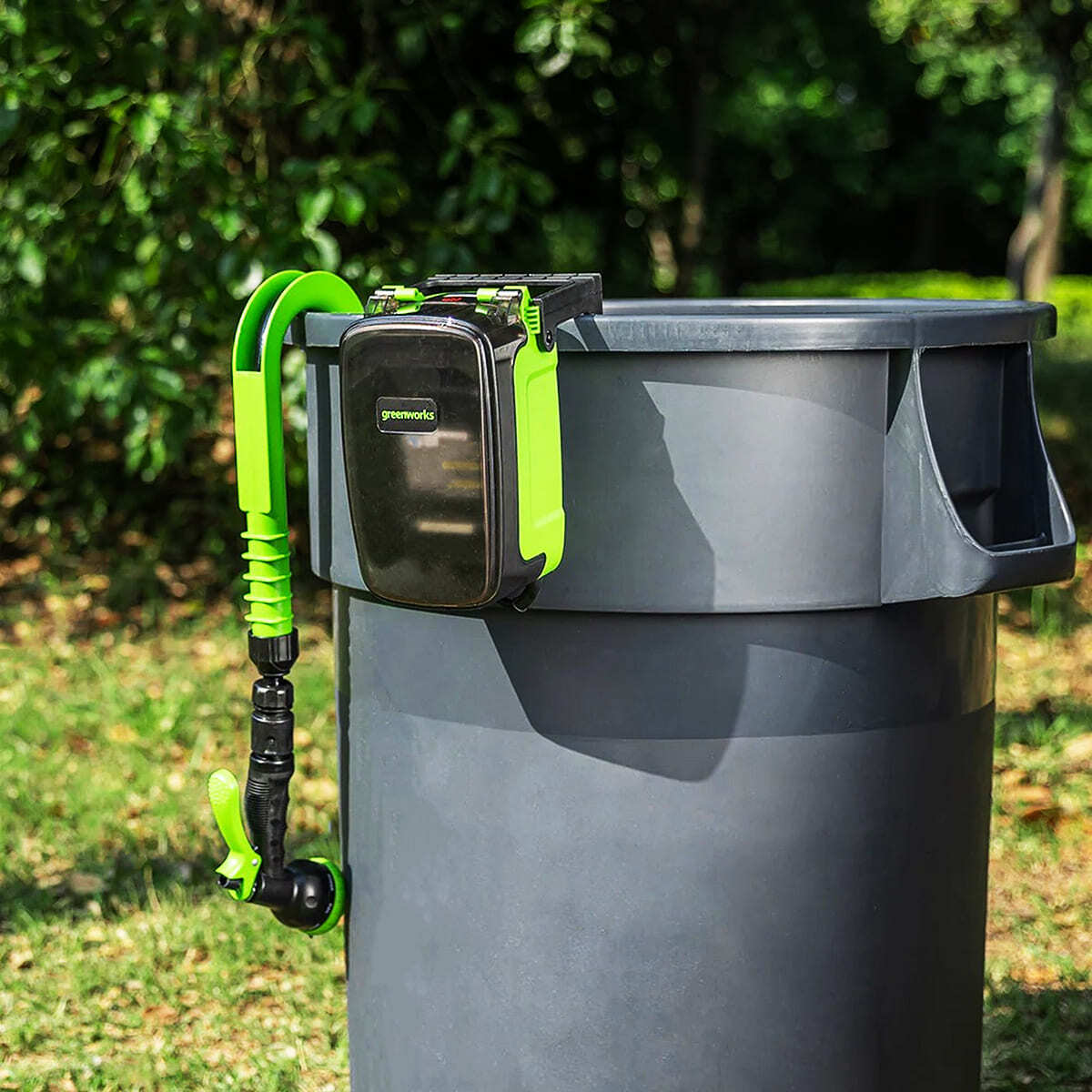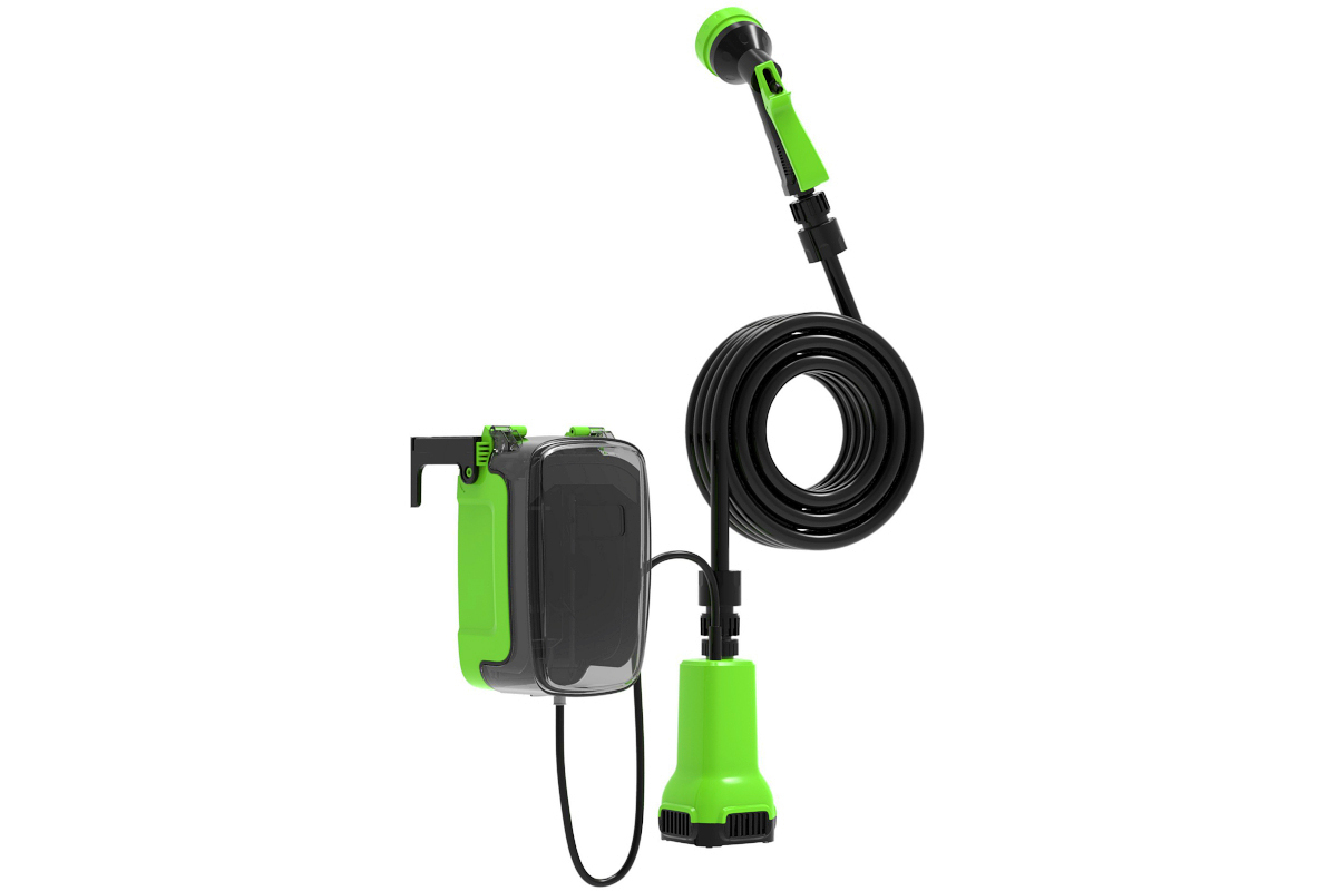 Блок погружного насоса опускается на дно бочки глубиной до 2 м, на бортах бочки крепятся блок с аккумулятором и шланг, через который насос подает воду.