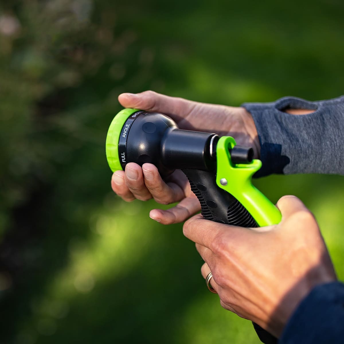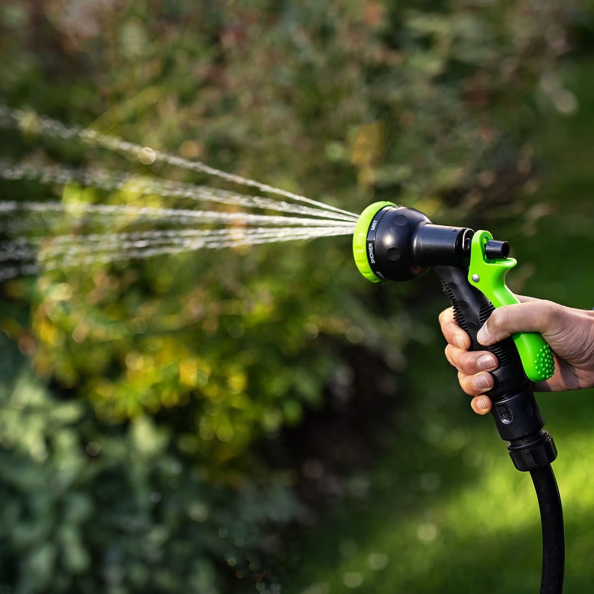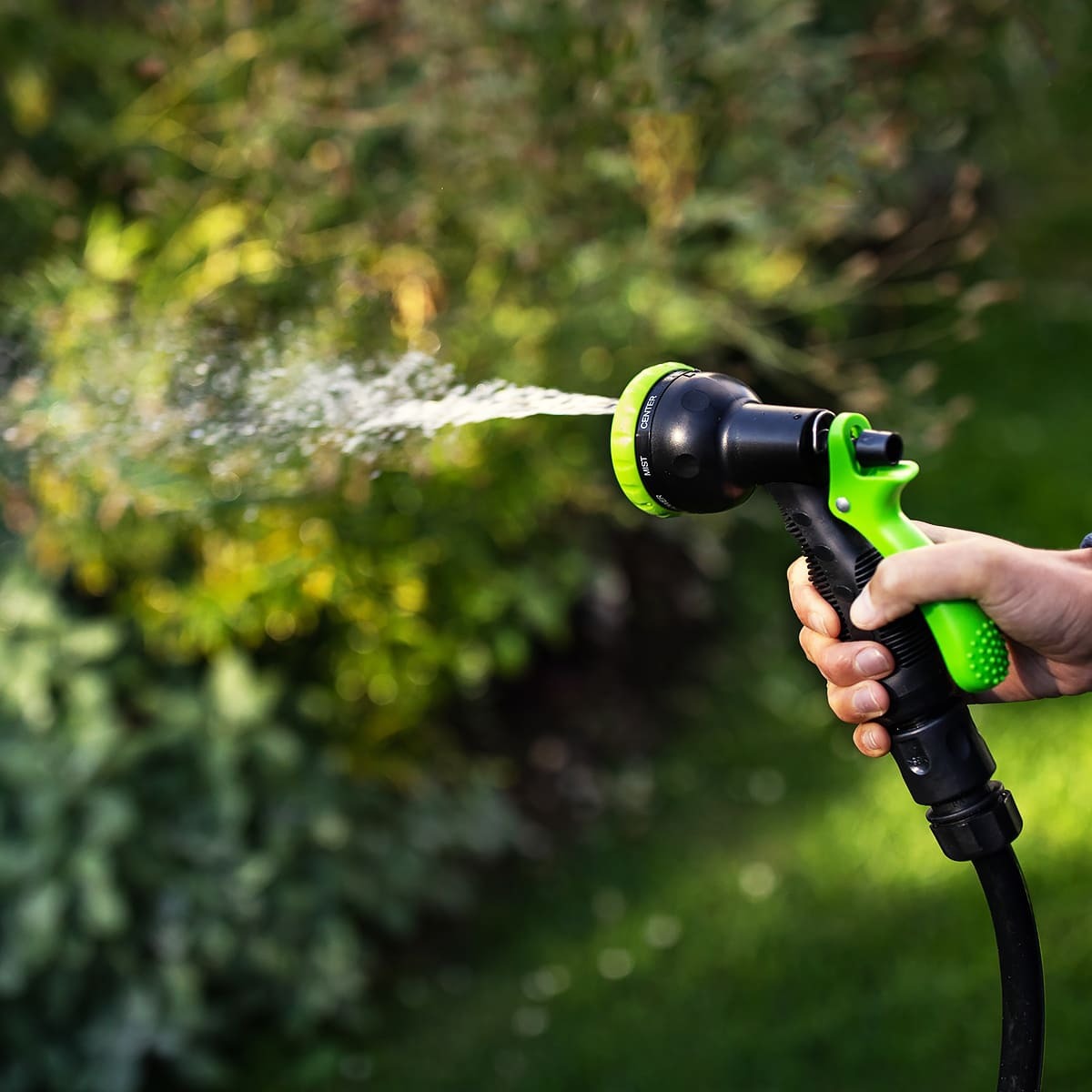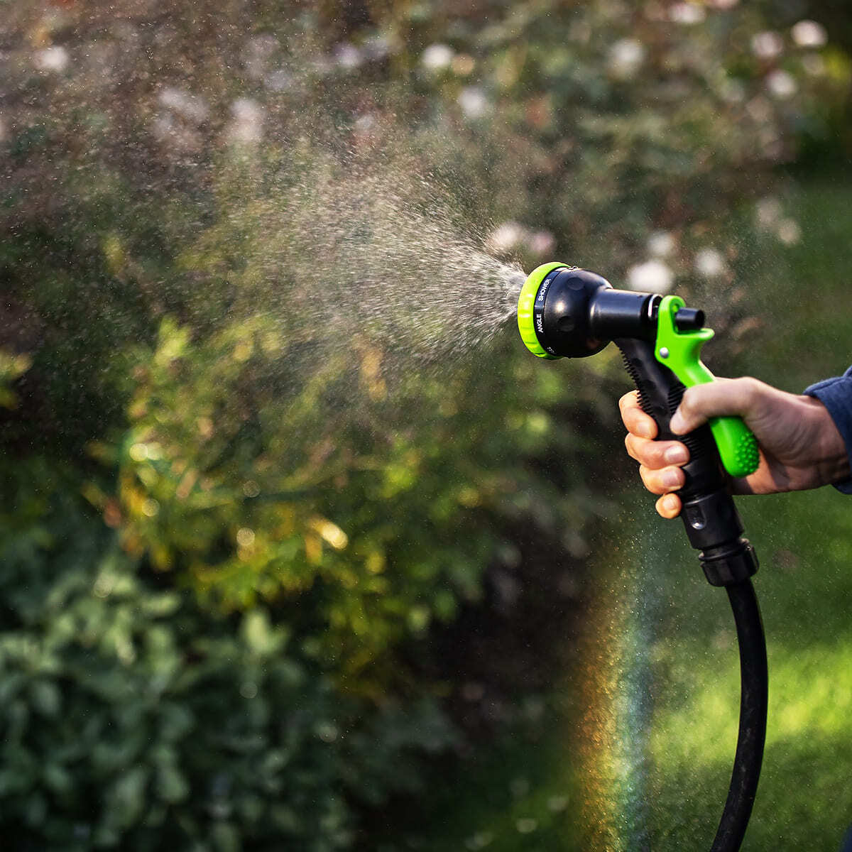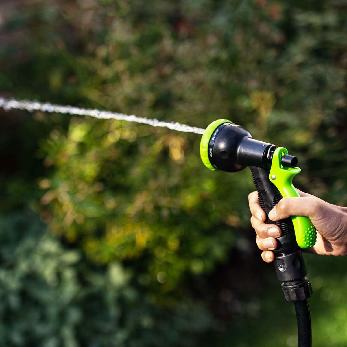 К этому шлангу при помощи коннектора присоединяется садовый шланг (в комплект не входит) с пистолетом-распылителем.