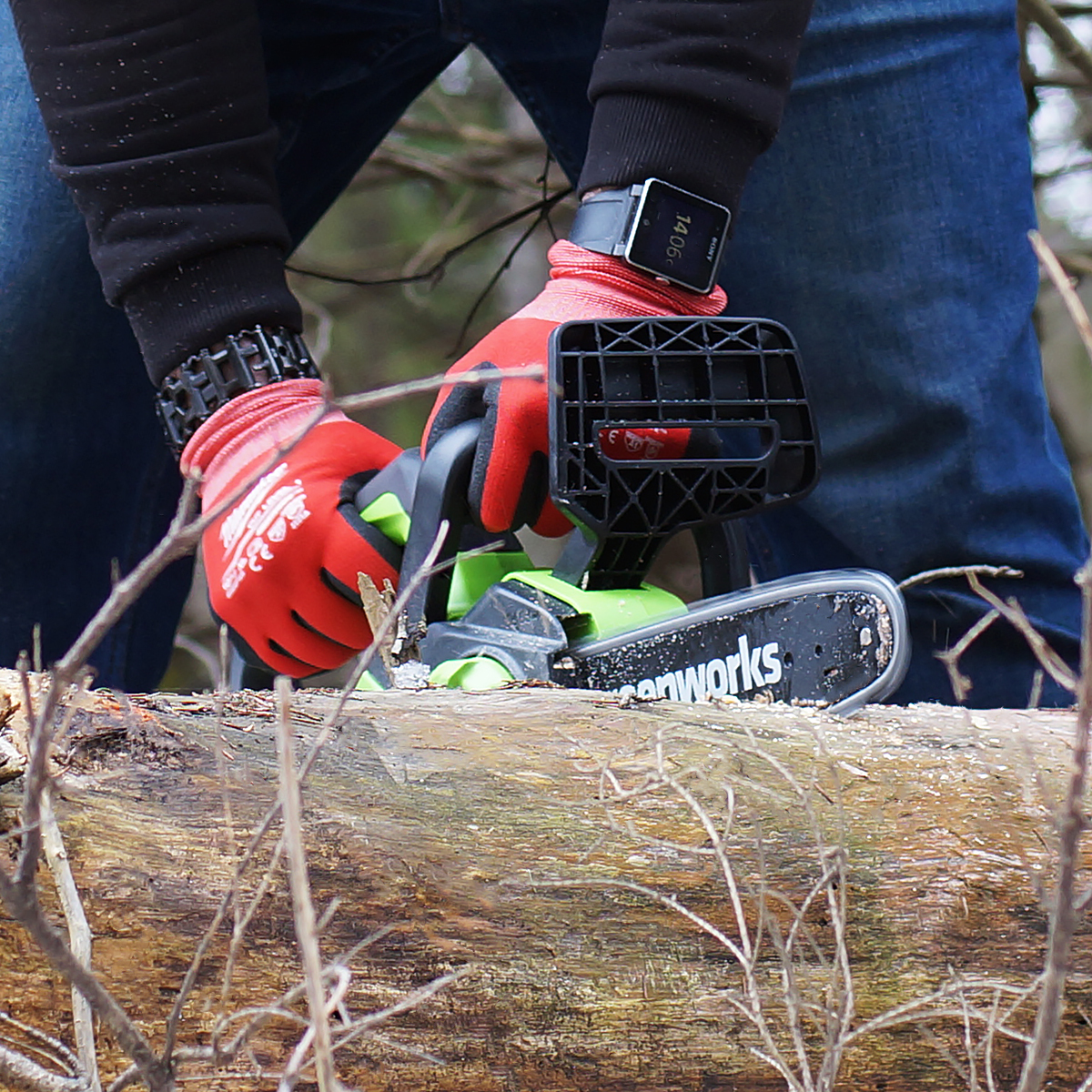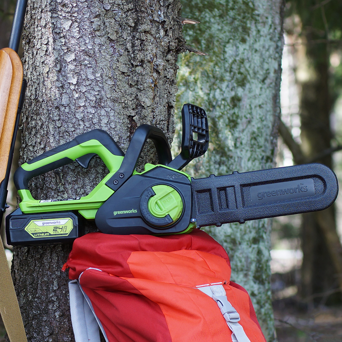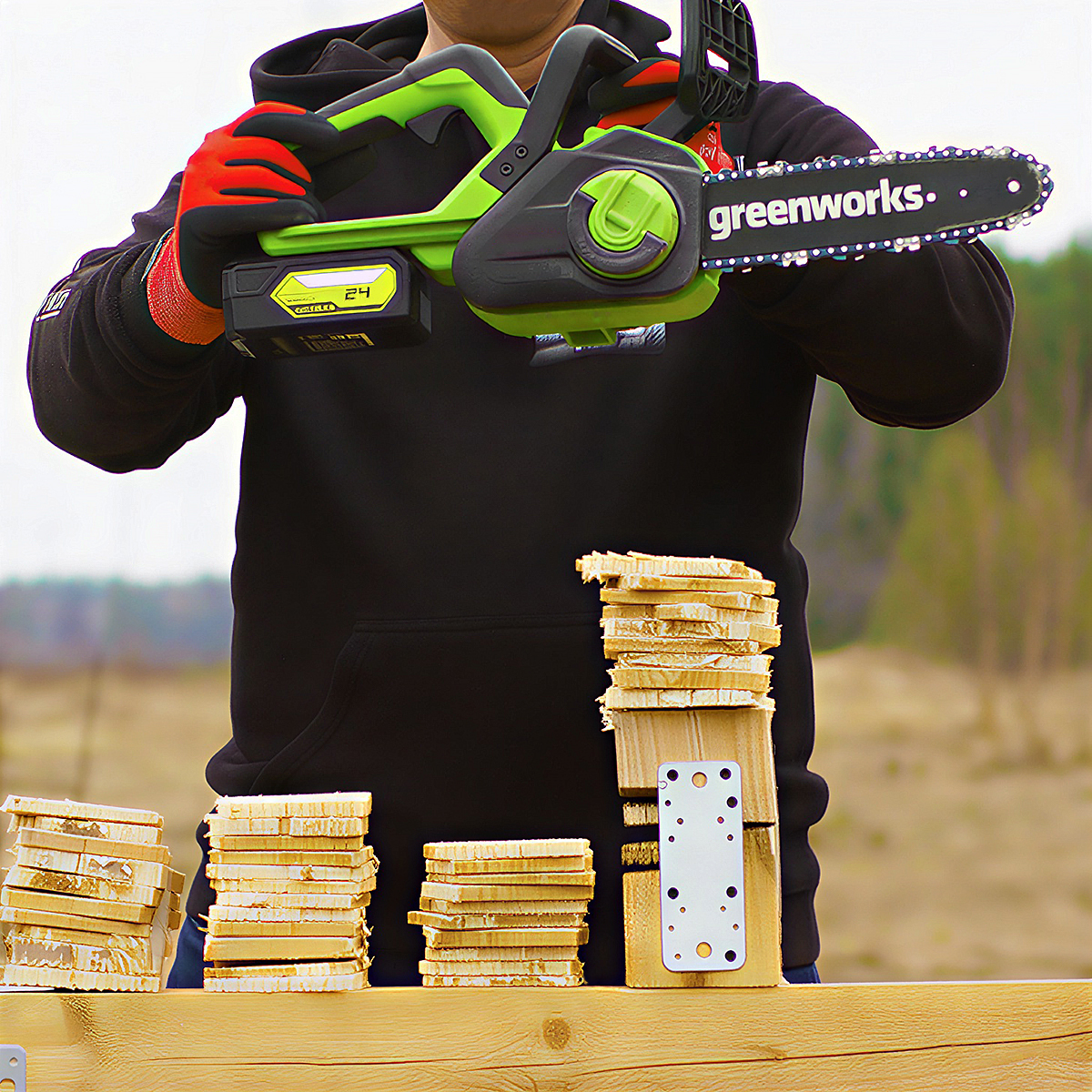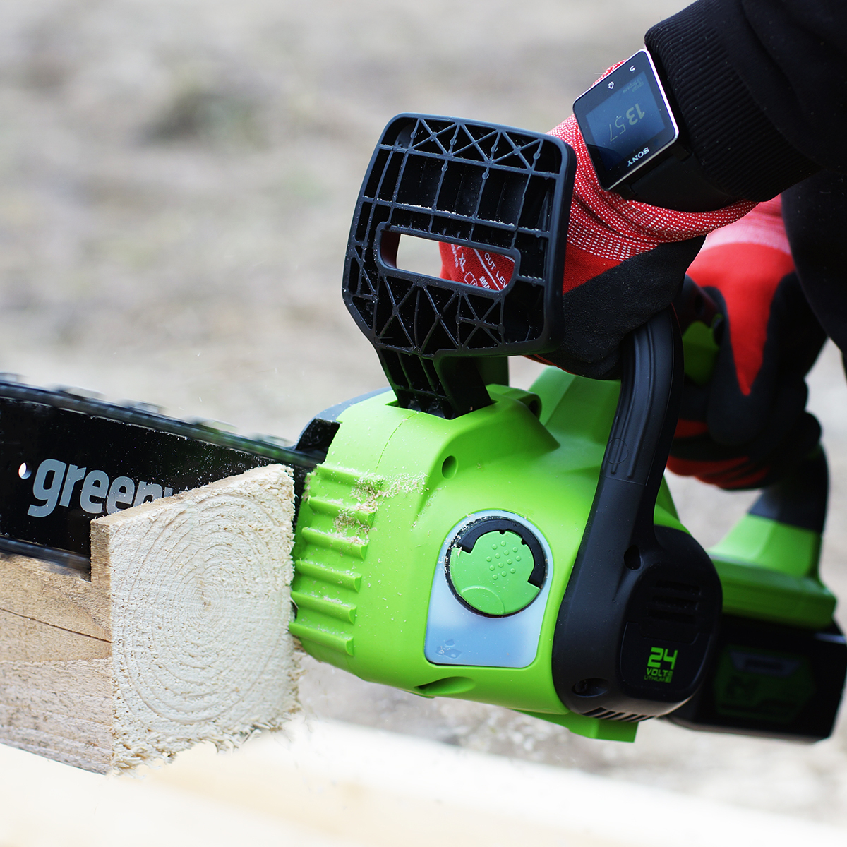 • Аккумуляторная цепная пила Greenworks мощностью 600 Вт обеспечивает мобильность и эффективность работы.