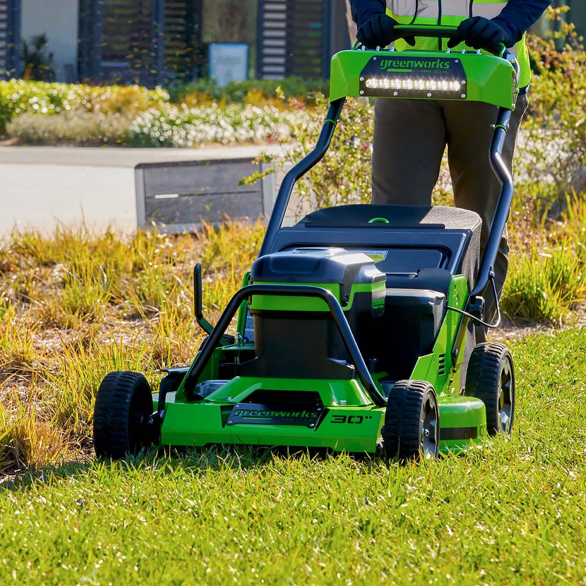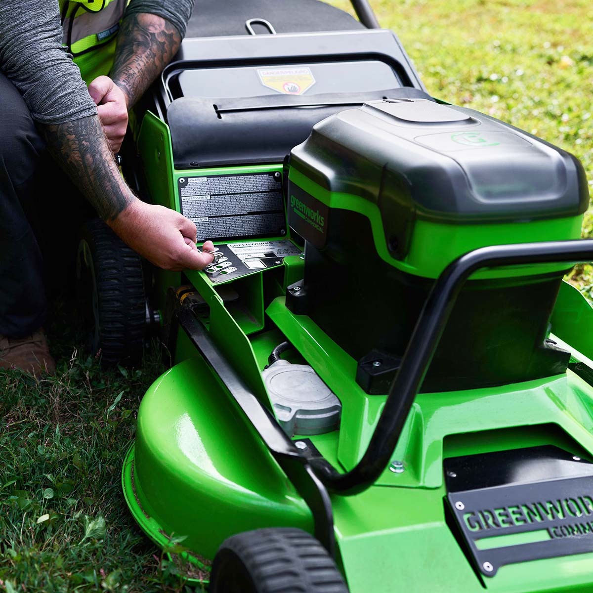 На стальной панели управления газонокосилки расположен крупный LCD-дисплей с индикацией моточасов.