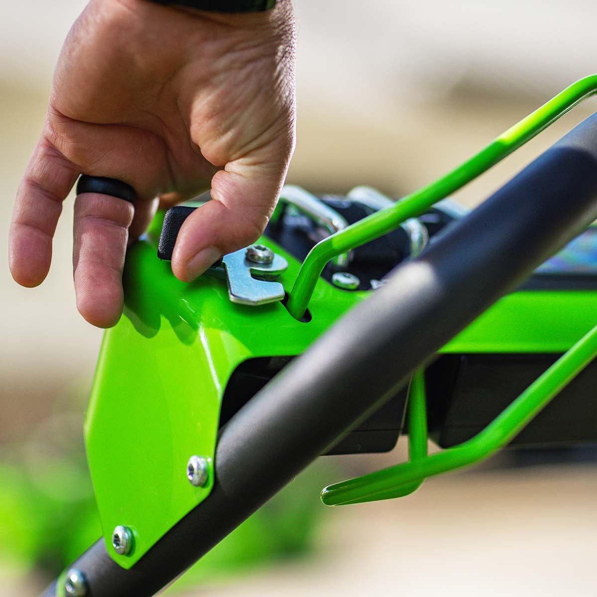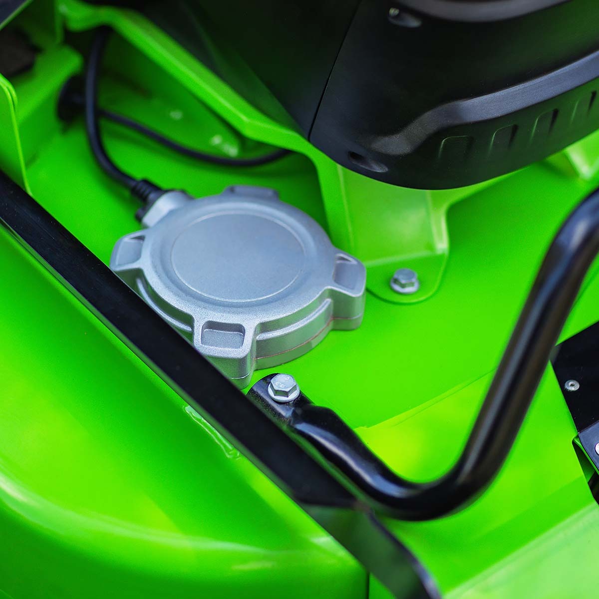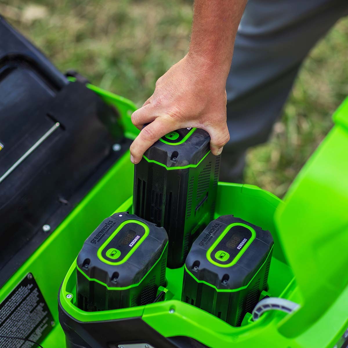 Тройной слот для АКБ с автопереключением обеспечивает покос до 3400 м² без подзарядки.