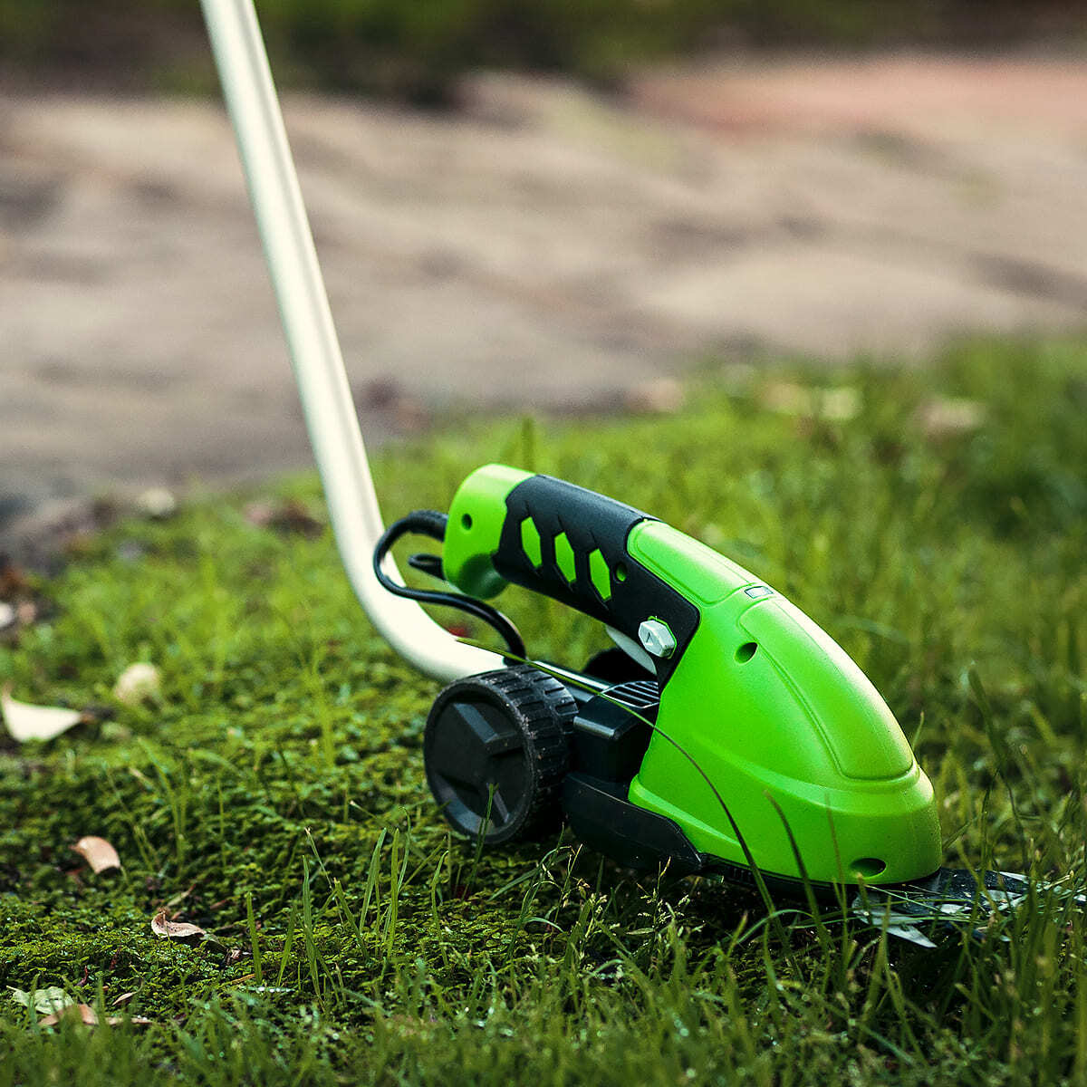• Штанга-удлинитель с опорными колесиками позволяет стричь газон без нагибания.