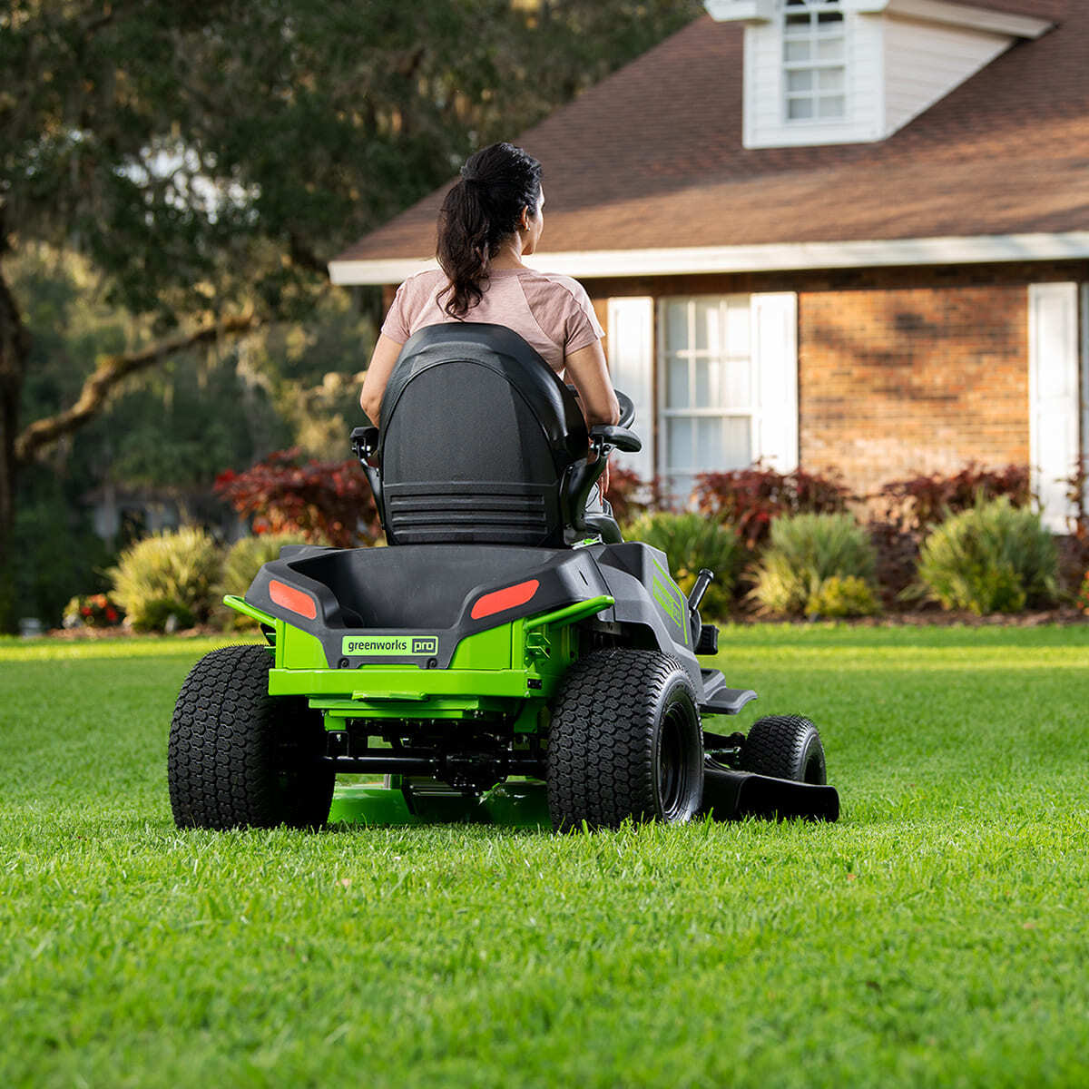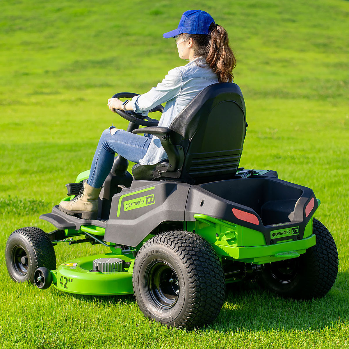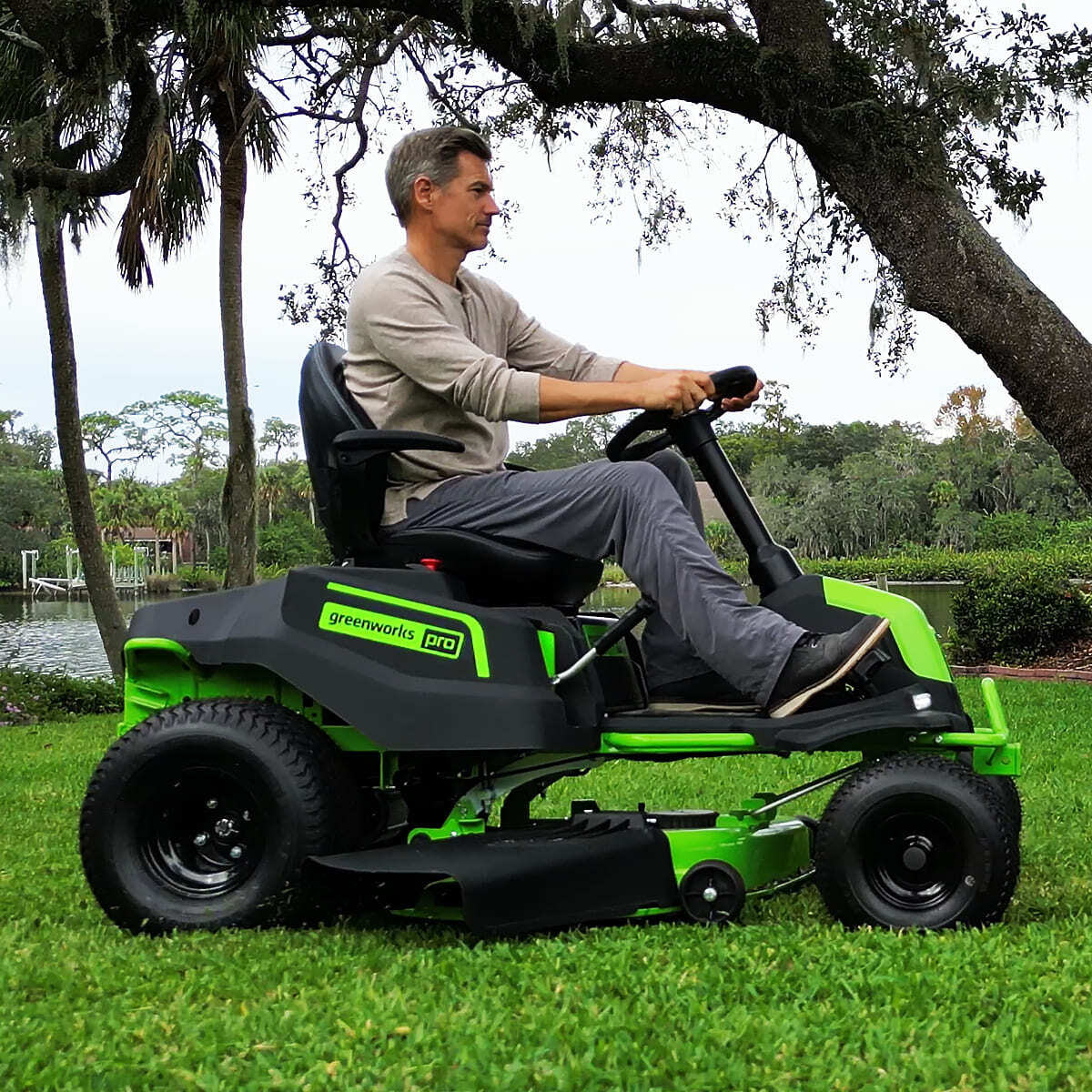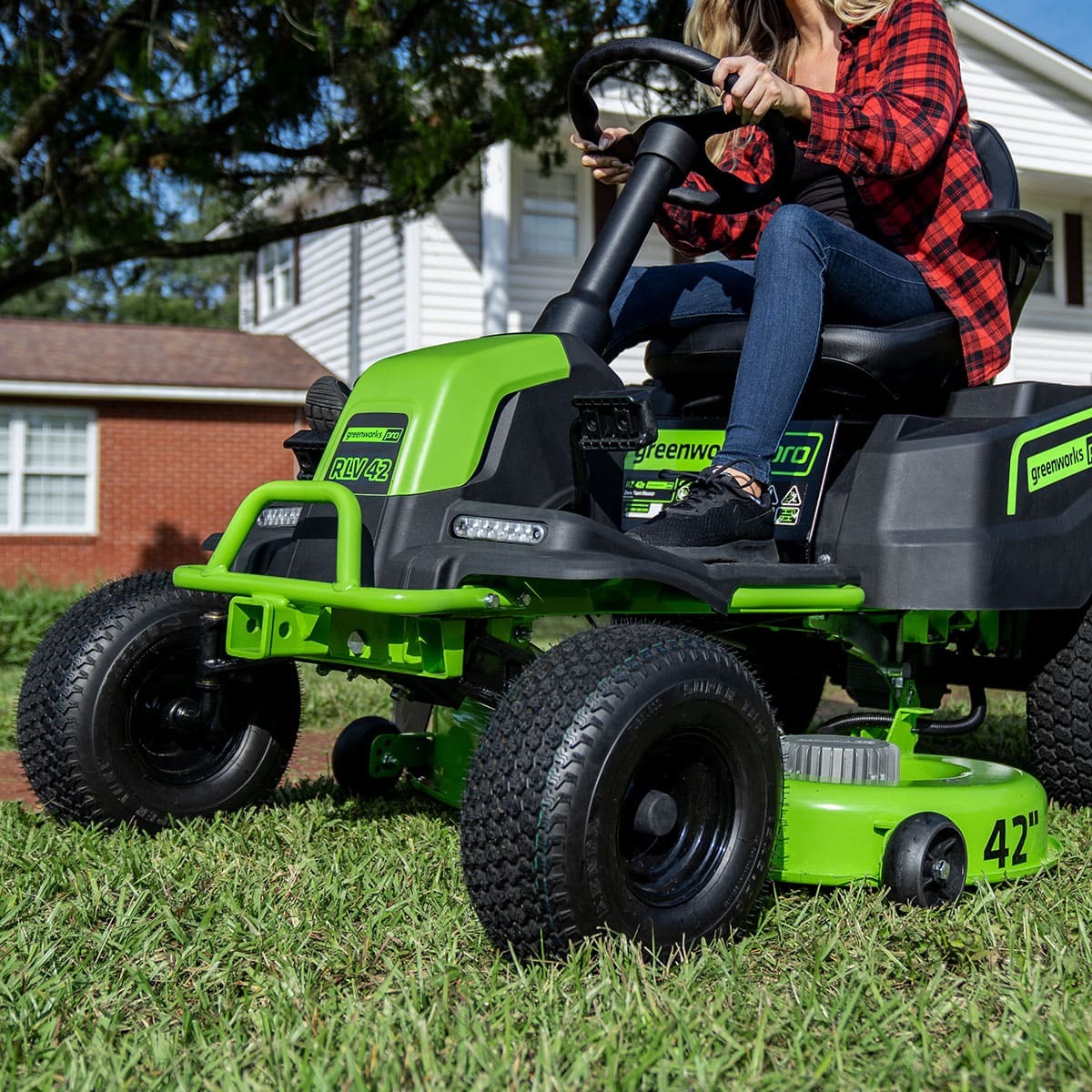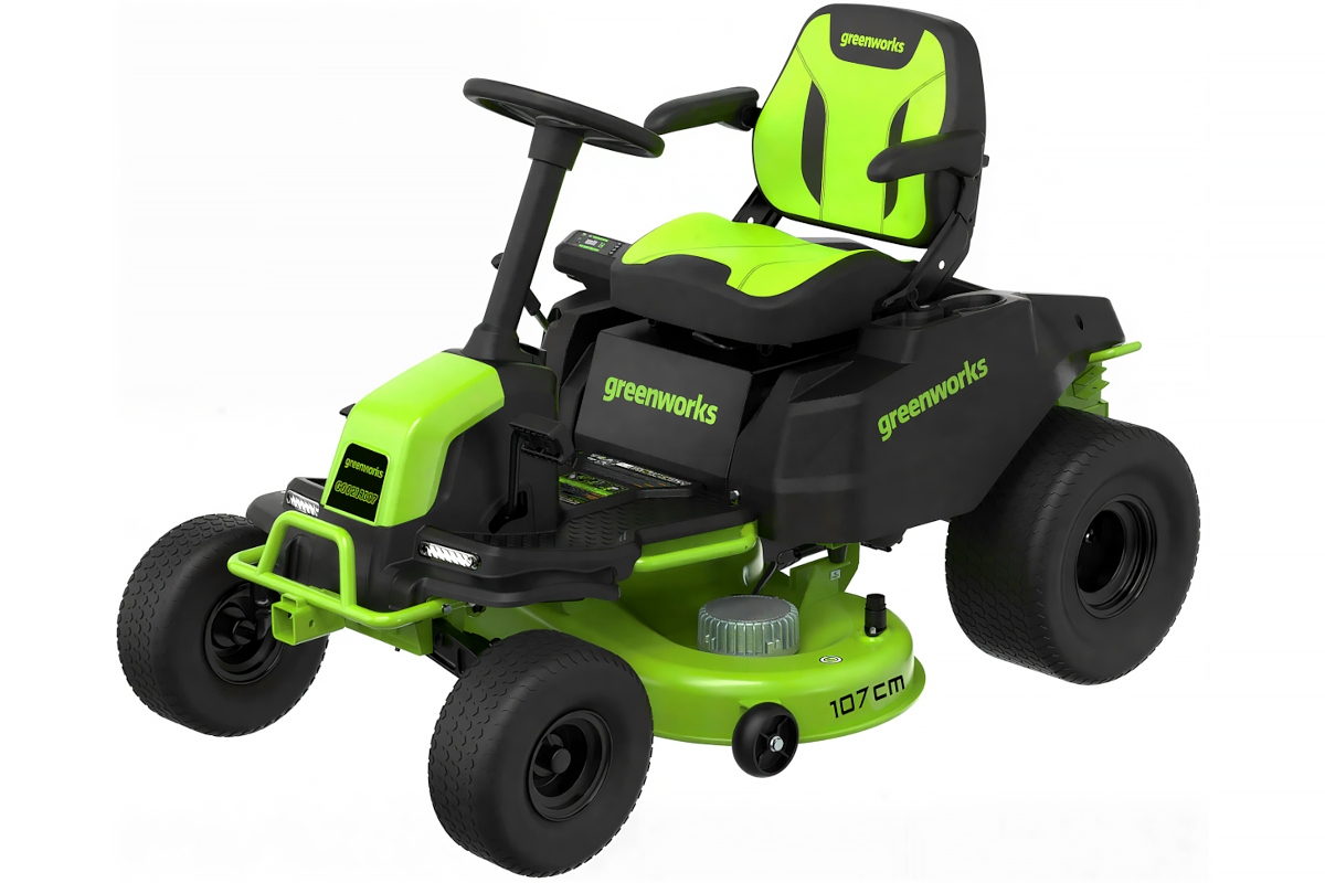 Садовый трактор оснащен стальной декой 107 см и двухмоторной системой (2×1,2 кВт DigiProTM) с прямым приводом ножей для максимальной производительности.