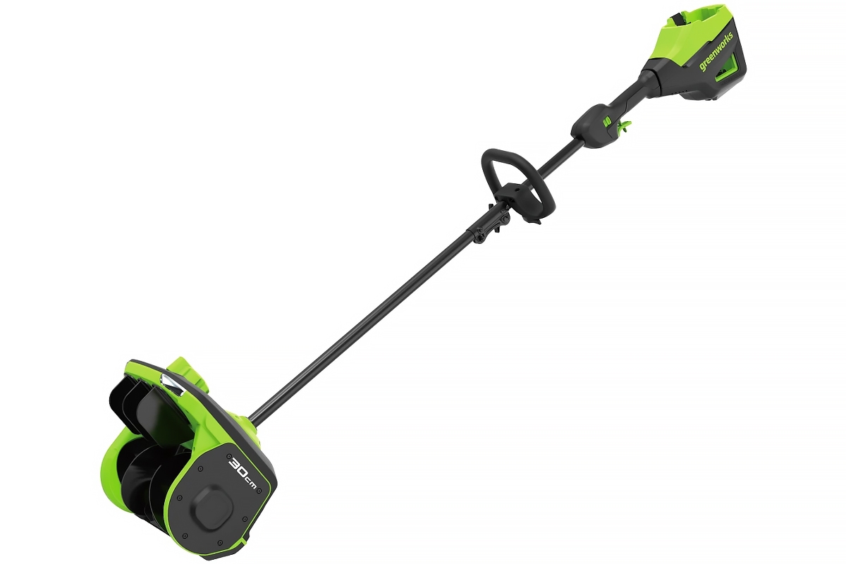 Направление выброса снега регулируется ручкой на ковше, позволяя отклонять на 30° вправо или влево.