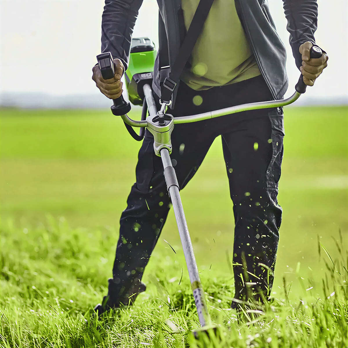 Прямая алюминиевая штанга из двух секций делает инструмент легким в транспортировке, а велосипедная рукоятка обеспечивает удобный хват и точный контроль во время работы.